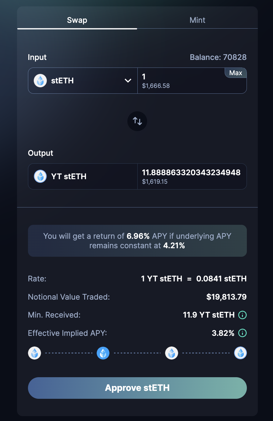 - 选择您的输入资产和金额(如有必要,将被交换为池的资产以购买YT)。这可以是与底层基础资产不同的代币,我们将找到交换您资产的最佳路径。