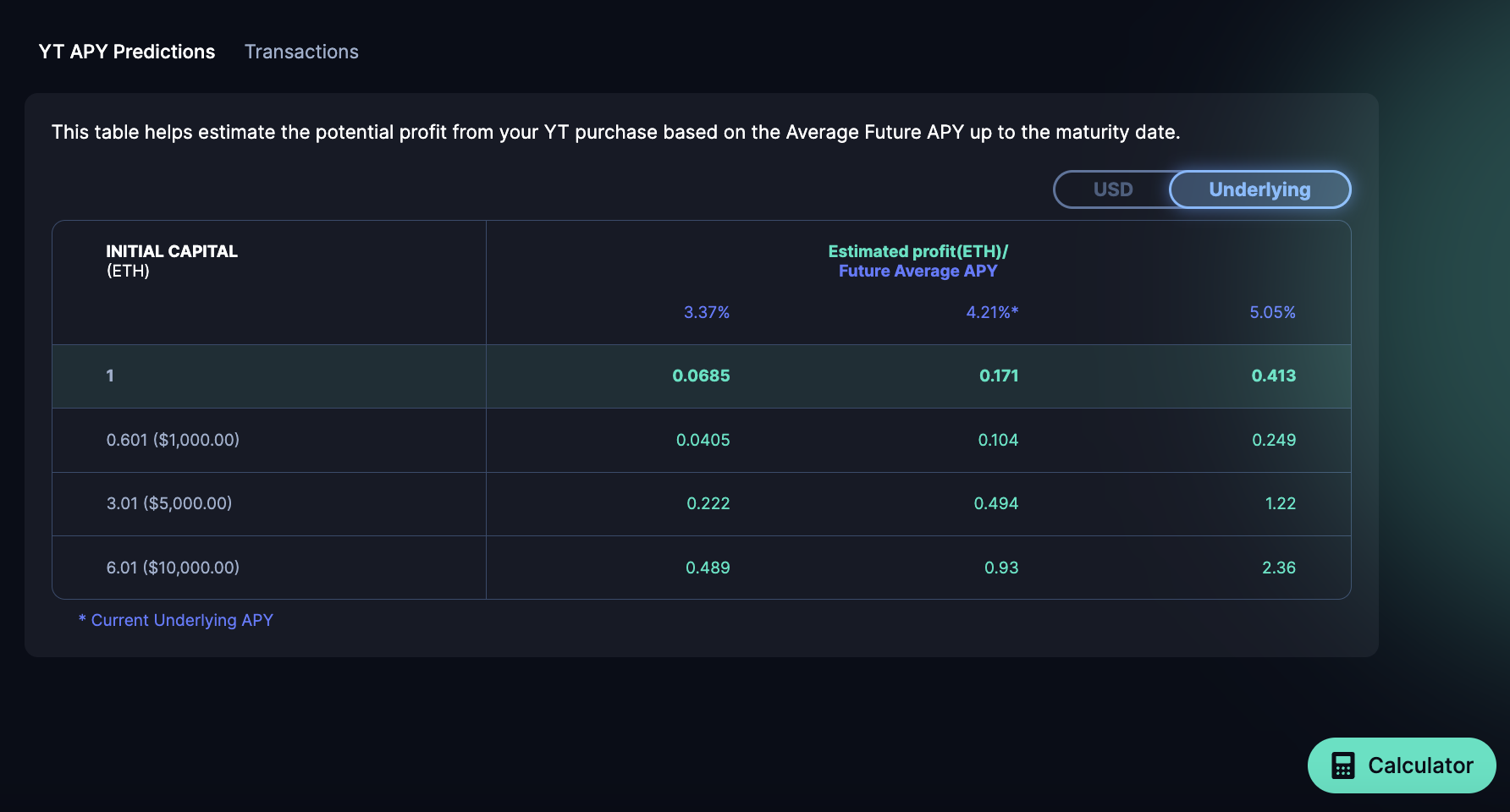- 查看价格影响和费用后的有效隐含年化收益率,这也是您YT的有效成本,以及您将获得的有效做多收益年化收益率。
