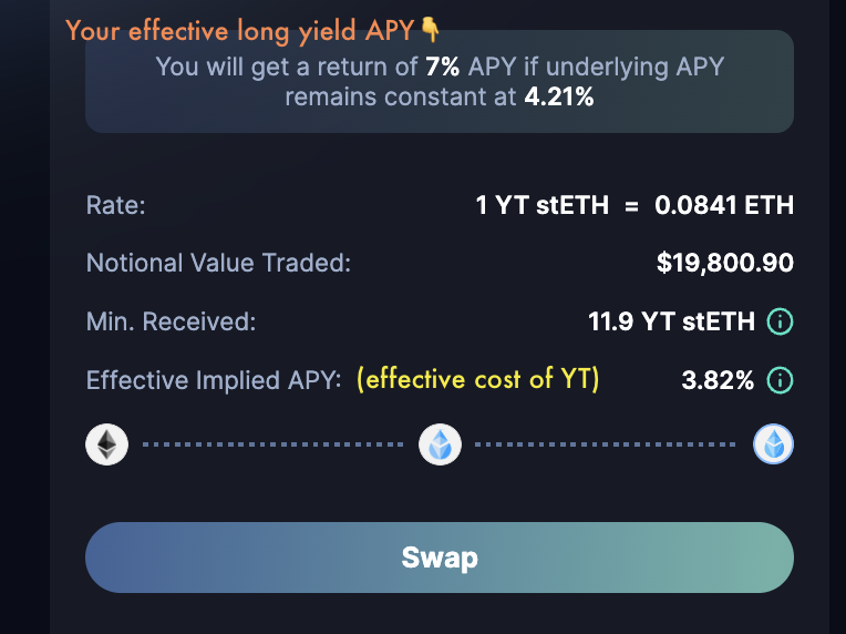 由于YT通常比本金便宜得多,通过购买YT您实际上获得了杠杆收益敞口。例如,在下面的图像中,您只需花费1个stETH的成本就可以获得约11.9个stETH的收益,这在名义交易价值中是11.9倍的有效杠杆。