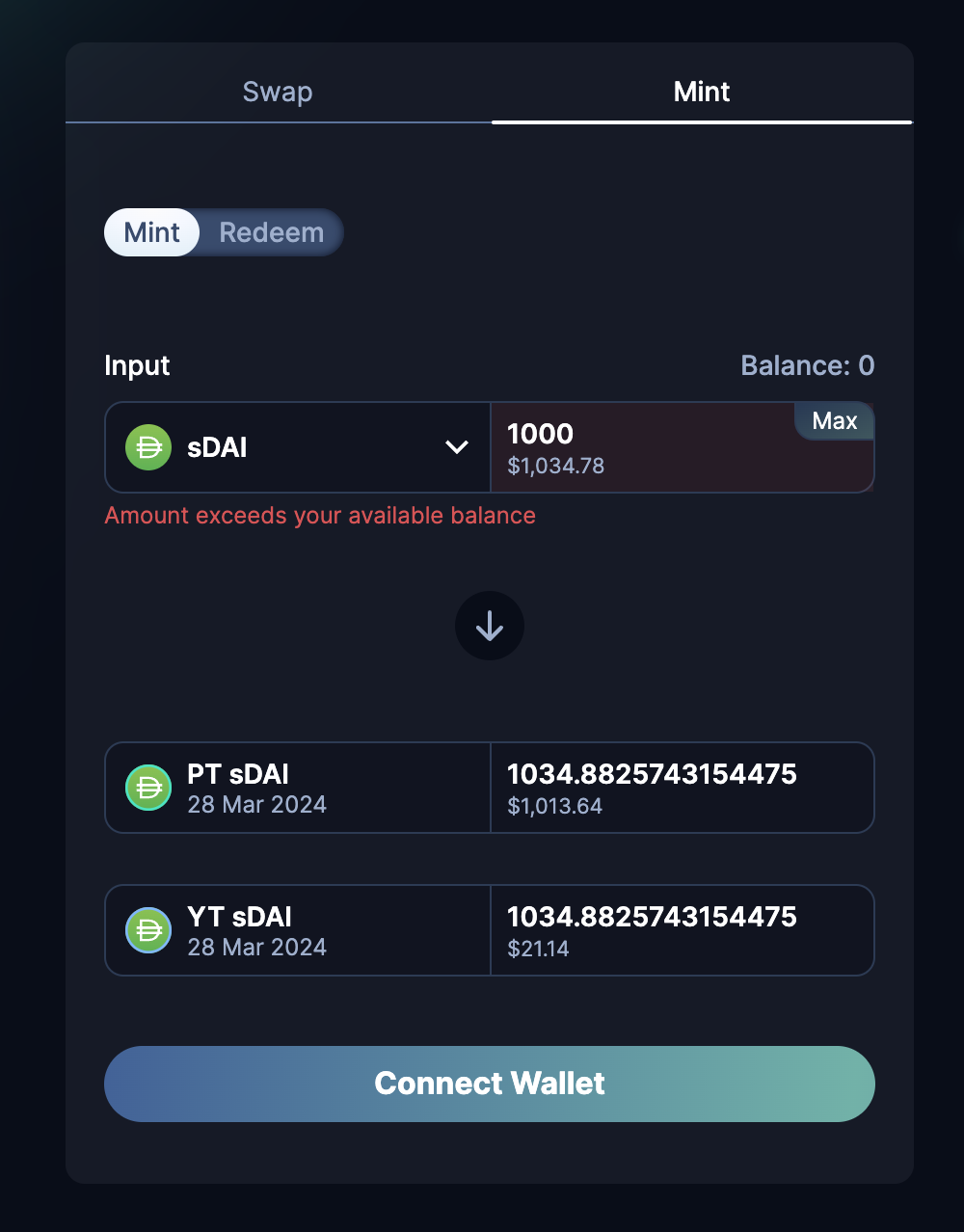 💡 您可以通过在市场页面- Markets 选择Pendle上的任何资产,并在页面左侧选择"铸造标签" 即 Mint 来在Pendle上代币化生息代币。