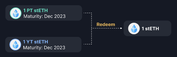 PT和YT的美元价值总和应该等于其底层基础资产,因为它们是整体的各个部分。您可以通过存入等量的PT和YT来赎回底层基础资产。到期时,PT可以在没有其YT对应物的情况下赎回其底层基础资产(这是因为到期的YT价值为0,因为它们不再产生收益)。
